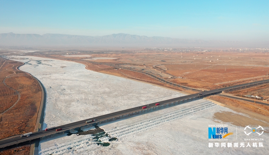隆冬時(shí)節(jié),流經(jīng)甘肅省張掖市甘州區(qū)的黑河河水結(jié)冰,銀裝素裹,從空中俯瞰如一條白色飄帶蜿蜒。