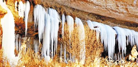 小路隨著山勢,曲折延伸。對面荒坡上隨處可見大大小小的洞穴,不知是經(jīng)年風(fēng)蝕,還是人工開采沙子所致。洞穴四周,散落著小小的冰瀑,有的似乎只有盈盈一握。長長短短的冰掛,一綹一綹,一排一排,遠(yuǎn)遠(yuǎn)近近錯(cuò)落有致地覆在山坳里,垂在砂石間,掛在懸崖上。一些細(xì)細(xì)長長的冰溜,像極了臘月里母親剛出鍋的粉條。搭在院子竹竿上的一掛粉條,下邊還垂著水珠,上邊早已凍成了細(xì)細(xì)的冰棒,而滴落在地上的水已凝成了冰堆。