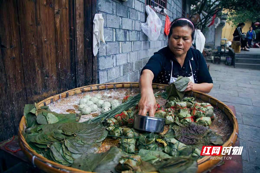 湘西吉首乾州古城內(nèi),一位商販正在制作蒿子粑粑。