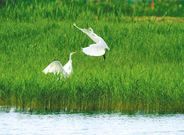 初夏的甘肅張掖國家濕地公園蘆葦青青,幾只白鷺在綠色的蘆葦中時(shí)而嬉戲飛翔,時(shí)而駐足覓食,成為濕地一道美麗風(fēng)景。 人民網(wǎng)照片