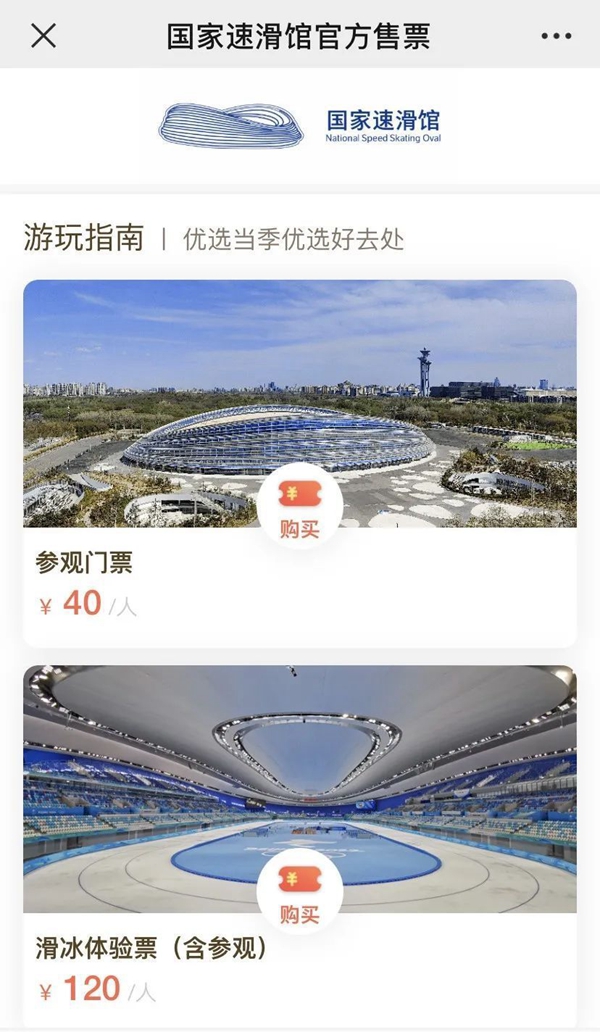 來這里參觀可以通過微信關(guān)注“國家速滑館”公眾號進行票務(wù)預(yù)約。參觀門票40元每人次。參觀加上冰的套票120元每人次。根據(jù)游客需求,也可以現(xiàn)場購買80元每人次的滑冰體驗票,其中包含了90分鐘的滑冰體驗和一套冰鞋一套護具。