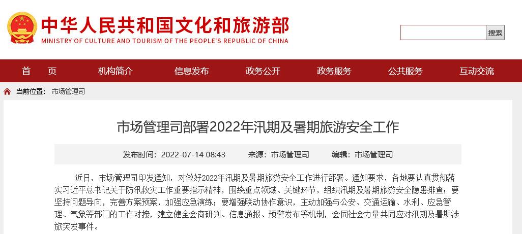 據文旅部網站消息,近日,文旅部市場管理司印發(fā)通知,對做好2022年汛期及暑期旅游安全工作進行部署。