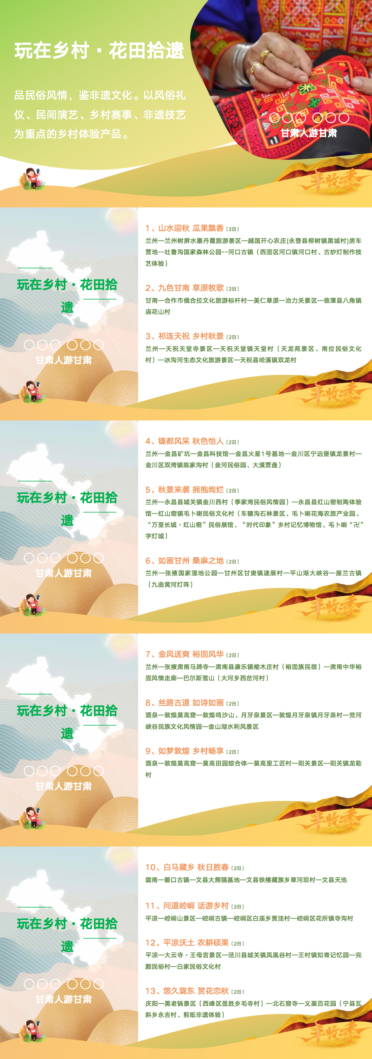 這5大類線路具體包括:游在鄉(xiāng)村·豐收節(jié)慶、玩在鄉(xiāng)村·花田拾遺、悟在鄉(xiāng)村·鄉(xiāng)土新知、品在鄉(xiāng)村·康養(yǎng)鄉(xiāng)居、賞在鄉(xiāng)村·臻味清歡,涵蓋了鄉(xiāng)村觀光、美食、住宿、游玩、體驗(yàn)、研學(xué)、康養(yǎng)等內(nèi)容,為金秋時(shí)節(jié)游客出行提供豐富的選擇,也為甘肅文旅市場聚人氣、促消費(fèi)提供了重要載體。