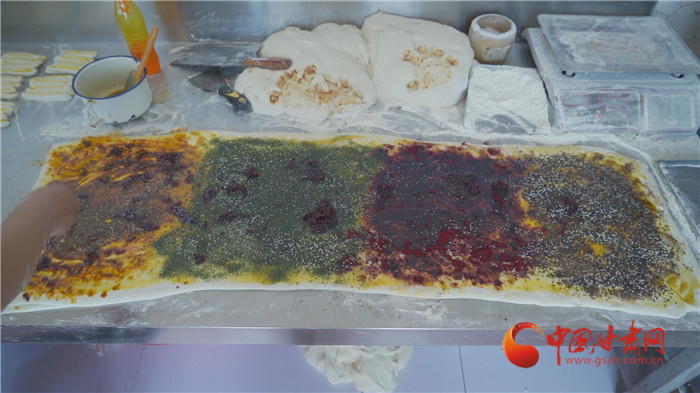 記者走進(jìn)榆中縣金崖鎮(zhèn)浩燕饅頭店,一股濃濃的胡麻油、玫瑰醬、香豆等混合的香氣撲面而來,李浩燕正在忙碌地趕制一批榆中傳統(tǒng)手工月餅。案板上除了發(fā)好的面團(tuán),還擺上了炒胡麻碎、姜黃、白砂糖等豐富的佐料。只見李浩燕從揉面開始,然后鋪餡、搟制、卷面、切分、披花,一道道工序一氣呵成。經(jīng)過一個多小時,新鮮美味的月餅出爐了,切開后,內(nèi)里豐富,色彩斑斕,咬上一口軟糯可口,回味留香。