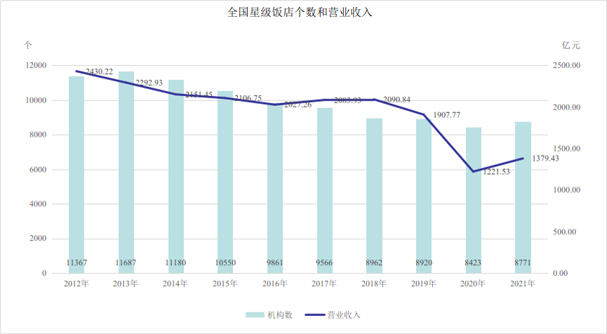 數(shù)據(jù)顯示,截至2021年,全國星級(jí)飯店總數(shù)達(dá)到8771個(gè),營業(yè)收入達(dá)到1379.43億元。