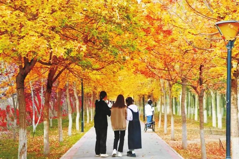 微風(fēng)輕拂,嬌黃的樹葉紛紛飄落,陽光透過葉片滲出幾分清朗,這是專屬秋的浪漫。隨便鋪開畫紙,蘸取一點點秋色,藍天、紅墻、金葉……都是最美的色調(diào)。古樸靜雅的校園彌漫著秋思,斑駁的陽光灑在圖書館的墻上,在濃濃的書卷氣中把農(nóng)歷十月寫進秋的詩行,有思念、有沉淀、有墨香……蘭州“醉”美的大學(xué)校園,每一片落葉都是美的化身,綿延了時光,溫情了步履……