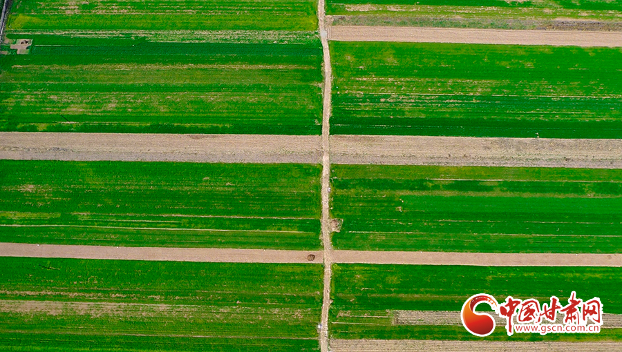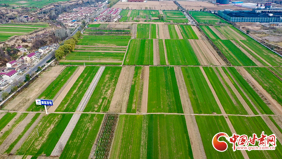 初冬時節(jié),平?jīng)鍪谐缧趴h錦屏鎮(zhèn)農(nóng)田里冬小麥長勢喜人,從空中俯瞰,給田野鋪上了綠色的地毯。