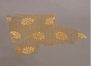 【粧金紗·元代·漳縣汪世顯家族墓出土】該墓葬中同時出土了許多元代的高級絲織品。此件粧金紗就是其中高級緞紋織物的一種。如棕色團花粧金緞、粧金或銀天馬紋緞、粧銀簇花文緞等等。它不僅是罕見的早期緞物標本,而且花色品種很多,非常珍貴。