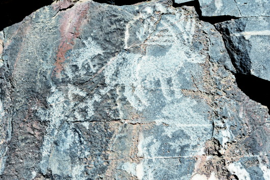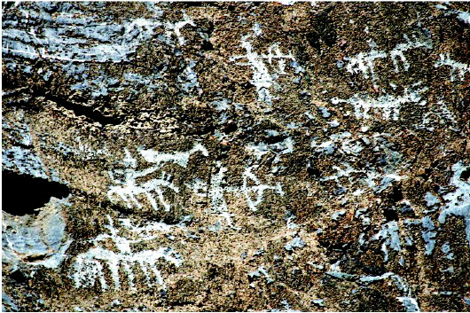 肅北縣大黑溝巖畫是全國重點(diǎn)文物保護(hù)單位,巖畫形成時(shí)間初步斷定在春秋、戰(zhàn)國至西漢時(shí)期,位于肅北縣城東約40公里處的大黑溝。巖畫共有34組,圖案190多幅,零亂分布在3.5公里長的山溝中,畫面內(nèi)容多為射獵、放牧、練武、乘馬作戰(zhàn)等場(chǎng)景和北山羊、野牛、野駱駝等動(dòng)物,畫面表現(xiàn)形式多以凹刻和凸刻,巖畫大多刻在避風(fēng)向陽的陡峭花崗巖和石灰石上。