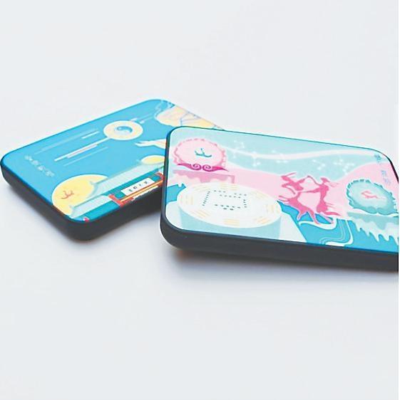 圖案來源于伏羲女媧因分別從山頂推下的兩磨盤緊緊結(jié)合的現(xiàn)象驗(yàn)證了上蒼意圖,決定繁衍后代的傳說?;瘌B騰飛之日與玉兔奔騰之月隔著天河星辰分懸兩邊,繪有河圖的磨盤見證生命的起源,雙人自由舞動的身軀揚(yáng)起歡騰的節(jié)律,完美契合于陰陽諧振的樂音。美好寓意的組合充溢起整個載體,令人傾心又矚目于彩色流韻的真景里。