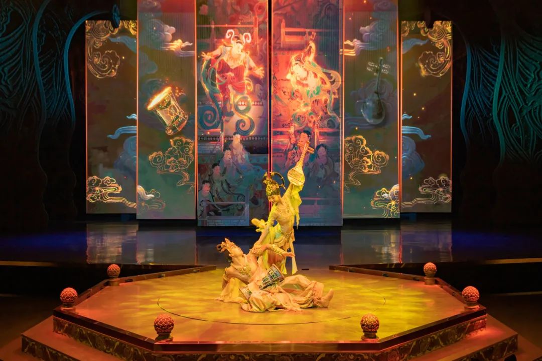 劇中運用了五弦琵琶、排簫等民族樂器及敦煌仿制樂器,演繹了胡旋舞、琵琶舞等敦煌舞蹈,配合取材自敦煌古樂譜和西域曲調的劇目樂曲,還原了敦煌壁畫中的樂舞盛景。在演出模式上,《樂動敦煌》打破了人和舞臺間的界限,讓觀眾置身劇場,近距離感受敦煌傳承千年的古樂文化魅力。