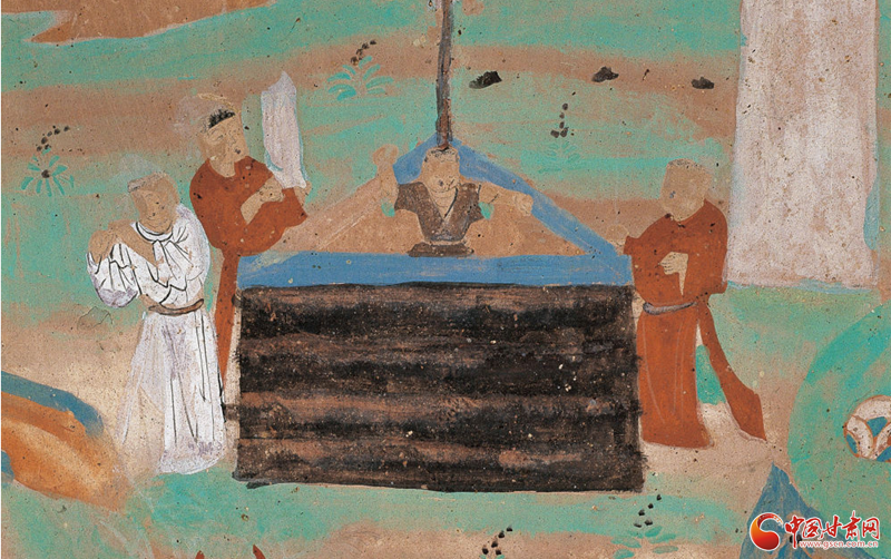 在宋代第55窟東壁門南側(cè)的金光明經(jīng)變右側(cè),有一幅壁畫,從上到下,將一個(gè)“流水長(zhǎng)者子救魚”故事娓娓道來。