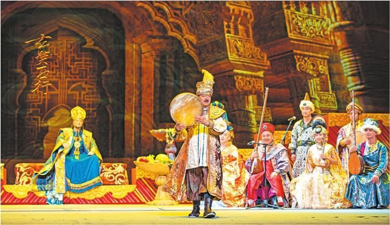 全劇主體部分由“佛門”“一念”“潛關(guān)”“問路”“遇險”“極樂”“高昌”“普度”“雪山”“祭天”“菩提”“那爛陀”“如夢”“大唐”14個章節(jié)構(gòu)成。每一個章節(jié)都把樂器與故事相結(jié)合,推動情節(jié)發(fā)展,表現(xiàn)人物內(nèi)心,從漢族傳統(tǒng)樂器笛、簫、塤、箏、鼓,到維吾爾族樂器艾捷克、薩塔爾、都塔爾,哈薩克族樂器冬不拉、庫布孜,塔吉克族樂器鷹笛、莎什塔爾,還有敦煌復(fù)原樂器箜篌、排簫、五弦琵琶,印度傳統(tǒng)樂器班蘇里笛等,呈現(xiàn)出來的樂器數(shù)量,令人驚嘆。據(jù)姜瑩介紹,全劇共演奏中外傳統(tǒng)樂器70余種。在舞臺呈現(xiàn)上,多媒體技術(shù)、舞美、燈光及服裝的綜合運(yùn)用,情景交融,新穎而獨(dú)特,給人一種身臨其境的真實感,沿著玄奘前行的足跡,大漠、星空、雪山……如在眼前。此外,劇目跨越時空,讓老年玄奘和青年玄奘隔空對話,將遼闊的時空壓縮于舞臺一瞬,以強(qiáng)烈的穿透力給觀眾以心靈上的啟迪和震顫。高昌王以樂會友部分,演奏人員從觀眾席上的出場,既讓人驚喜,也是一種沉浸式的觀看體驗,強(qiáng)烈的互動性和感染力,點(diǎn)燃了觀眾的熱情。
