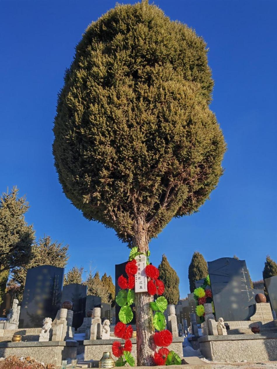 遼寧阜新市公墓的東南角,一棵挺拔翠綠的柏樹(shù)樹(shù)干上,掛有一個(gè)長(zhǎng)30厘米、寬10厘米的小木牌,上寫(xiě)有“魏彤欣之墓”,一束花環(huán)環(huán)繞周?chē)?,在?yáng)光的照耀下格外絢麗。