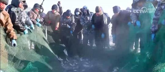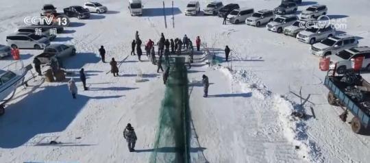 在克什克騰旗達(dá)里湖現(xiàn)場,人工鑿冰、冰下走網(wǎng),冬捕隊(duì)員在作業(yè)時選用5公分網(wǎng)眼,這樣捕魚時就能漏掉小魚。馬拉絞盤將大網(wǎng)拖拽出網(wǎng)口,滿載魚兒的漁網(wǎng)慢慢地從湖水中出來,游客們感受豐收的喜悅。