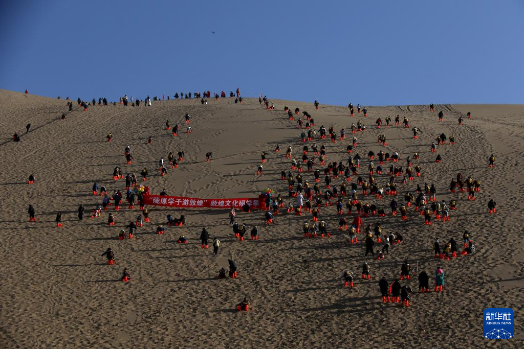 1月16日,研學團隊學員在甘肅省敦煌市鳴沙山月牙泉景區(qū)開展登山比賽。新華社發(fā)(張曉亮 攝)