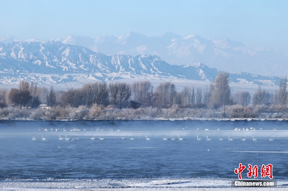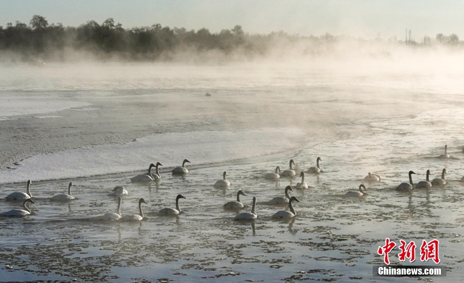 1月21日清晨,甘肅張掖市黑河國(guó)家級(jí)自然保護(hù)區(qū),受低溫影響,黑河水面霧氣氤氳縹緲,天鵝在水中暢游,野鴨等候鳥在空中飛舞,宛如一幅水墨生態(tài)畫卷。圖/CNSphoto 成 林 攝