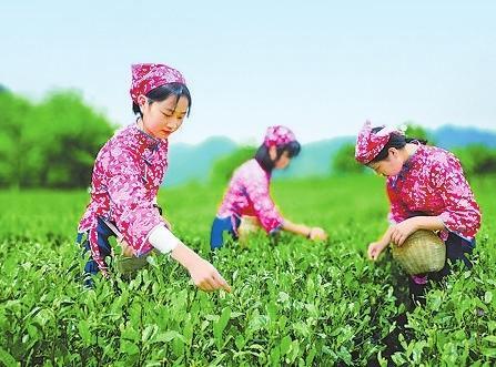 走進(jìn)茶園里,看到數(shù)名茶農(nóng)身挎小竹籮,慢慢穿行在茶樹(shù)之間,只見(jiàn)她們動(dòng)作快速而嫻熟,一捻一放,徐徐前行在滿眼的綠意里。