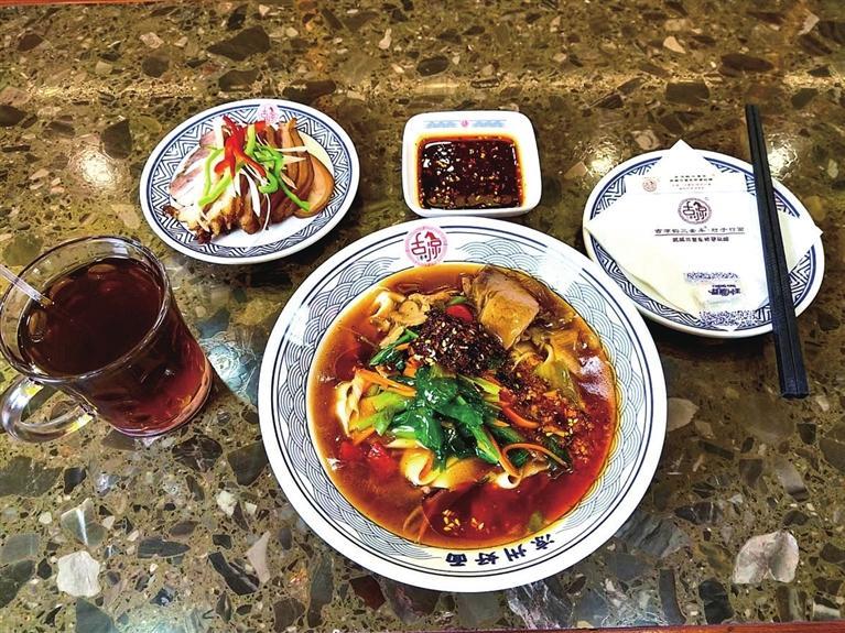 涼州,不僅有悠久的歷史、燦爛的文化,而且有回味無(wú)窮的美食。每天中午時(shí)分,位于雷臺(tái)綜合體的古凉韻“三套車(chē)”店里,食客絡(luò)繹不絕。從北京遠(yuǎn)道而來(lái)的程先生一行四人,特地前來(lái)打卡武威的這道特色美食。一碗行面、一盤(pán)鹵肉、一杯茯茶的組合,讓他們吃得津津有味。