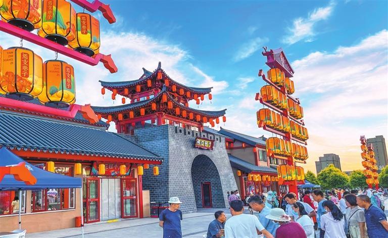 夏日的傍晚,這里格外熱鬧。步入巷內,穿過仿古牌坊,行走在青石板路上,經(jīng)過新中式仿古的巷子,寬敞的街道兩邊都是仿古的建筑,曲徑通幽處,美食坊,手工作坊,酒吧街,一字兒鋪排開,小攤上當?shù)刈灾频纳介?、農(nóng)民自己種的各種蔬菜、自制的各種小工具、精美小籮筐、葫蘆瓢等好多物品勾起了兒時的回憶。