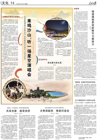 新場景造就文旅新機遇。采訪中,記者發(fā)現(xiàn),這場沙漠中的演唱會,吸引游客的不僅是音樂。燈光秀、無人機秀、沙屏秀穿插亮相,炫彩熒光棒、鹿角發(fā)光發(fā)箍備受歡迎。演唱會成為當?shù)匚穆镁仃囍兄匾画h(huán),與敦煌莫高窟、敦煌博物館、雅丹國家地質(zhì)公園等景點串連成線,讓游客獲得更多元、更豐富的游覽體驗。