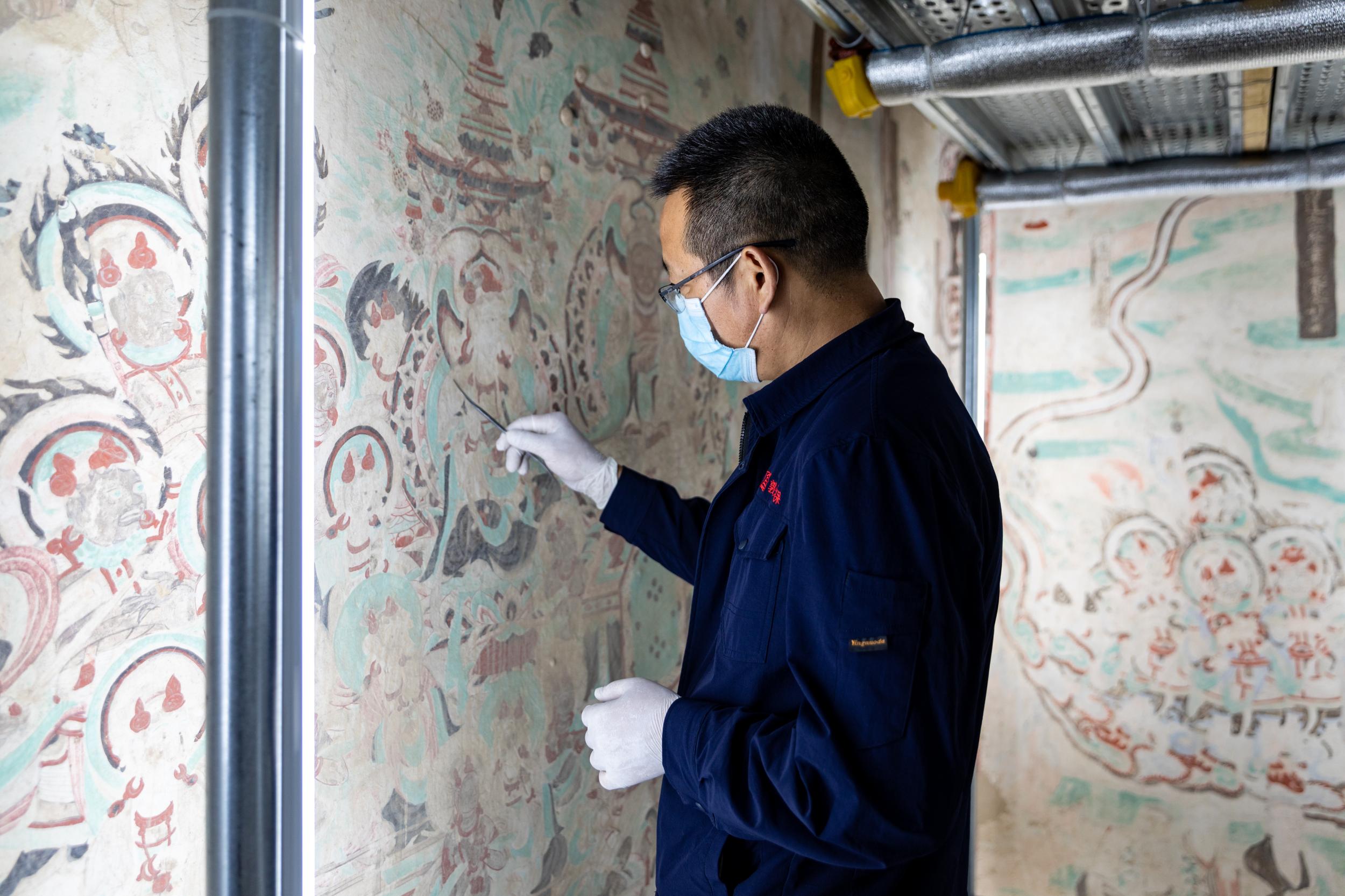 “壁畫比較常見的病害,有酥堿、起甲、龜裂、空鼓等等。”付有旭介紹,其中最為棘手的病害之一,就是素有壁畫“癌癥”之稱的酥堿。其形成過程復雜,危害較大,最難治理,敦煌研究院的壁畫修復師們不斷研討方案,采用控制水分和濕度、用自制工具吸附鹽分等方法,因地制宜,才讓酥堿病害得到有效控制。