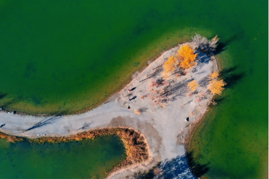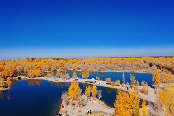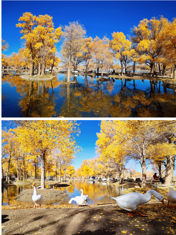 金波湖是金塔胡楊林的心臟,是臨水胡楊的最佳拍攝地之一。湖面倒映著胡楊高大的身影,多姿的樹干,黃色的樹葉,都毫不保留地在水中展示出來(lái)。小橋流水、碧波蕩漾、白鵝嬉戲,若不是周邊金黃色的胡楊提醒,會(huì)讓人誤以為來(lái)到了江南水鄉(xiāng)。