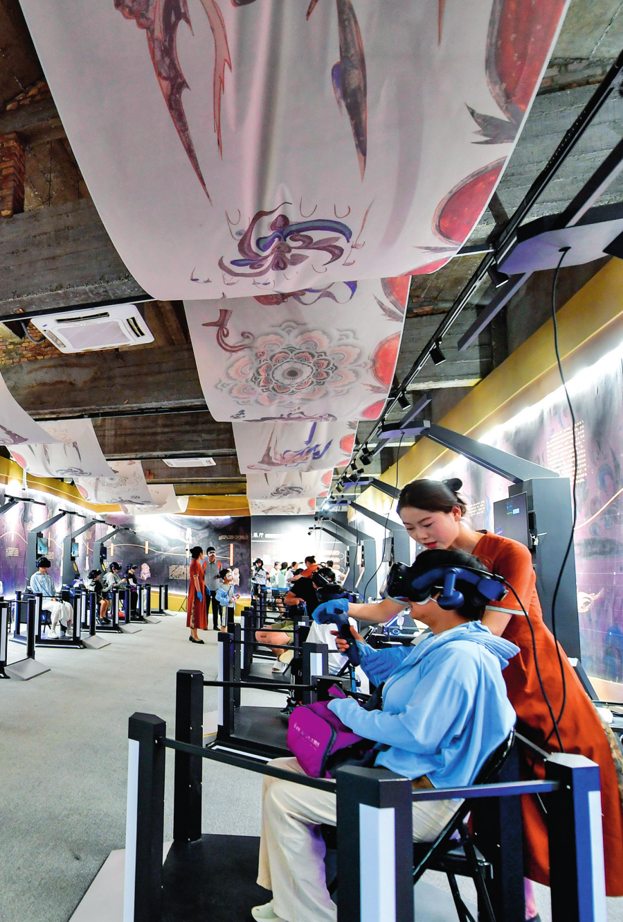 游客在敦煌體驗“尋境敦煌——數(shù)字敦煌沉浸展”(2024 年 7 月 22 日攝) 郎兵兵攝 / 本刊