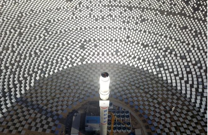 人們驚呼,這是自然力與人類(lèi)智慧的完美創(chuàng)造:戈壁荒灘上“種”出了人造太陽(yáng)。這個(gè)100兆瓦熔鹽塔式光熱電站,占地面積相當(dāng)于780個(gè)足球場(chǎng),每年所生產(chǎn)的綠電可減排35萬(wàn)噸二氧化碳。