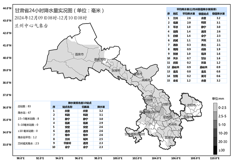 中國甘肅網(wǎng)12月10日訊(西北角·中國甘肅網(wǎng)記者 沈文剛)12月9日8時至12月10日8時,全省共計67個縣區(qū)出現(xiàn)降雪,其中蘭州南部、臨夏南部、平?jīng)鑫鞑俊⒍ㄎ鳀|部局部地方出現(xiàn)中雪。目前,較大累積降雪量出現(xiàn)在永登3.2mm、和政3.1mm、靜寧3.0mm、臨夏2.9mm、通渭2.6mm。蘭州本站降水2.5mm。