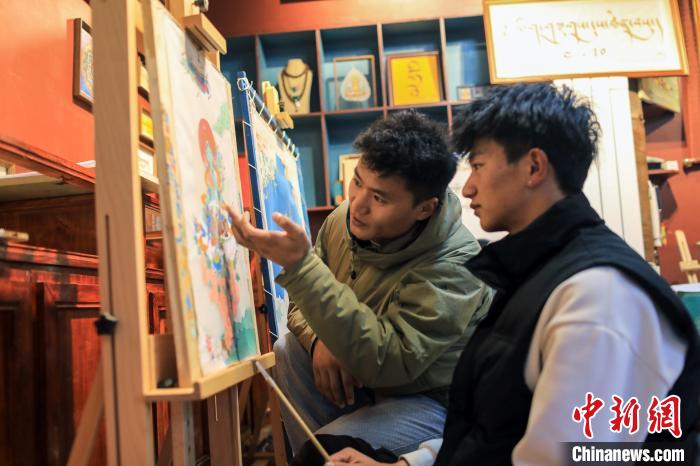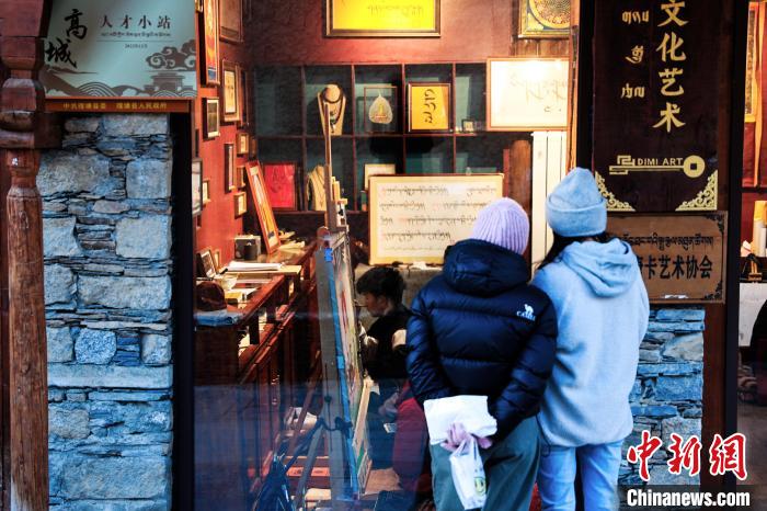 12月22日,在勒通古鎮(zhèn)的“唐卡館”,一位畫(huà)師繪制唐卡吸引游客駐足觀看。中新社記者 薛蒂 攝