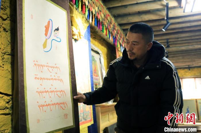 12月22日,藏文書(shū)法家昂旺曲批介紹自己的藏文書(shū)法作品。中新社記者 王磊 攝