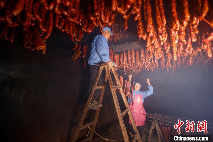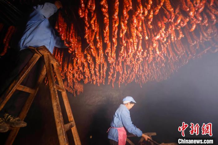 圖為貴州施秉一企業(yè)工人在下架剛熏制好的香腸。新年臨近,貴州省黔東南苗族侗族自治州施秉縣部分農(nóng)戶(hù)和企業(yè)紛紛加工趕制臘肉、香腸、血豆腐等傳統(tǒng)臘味,通過(guò)“線上+線下”銷(xiāo)售方式,供應(yīng)市場(chǎng),喜迎新年。磨桂賓 攝