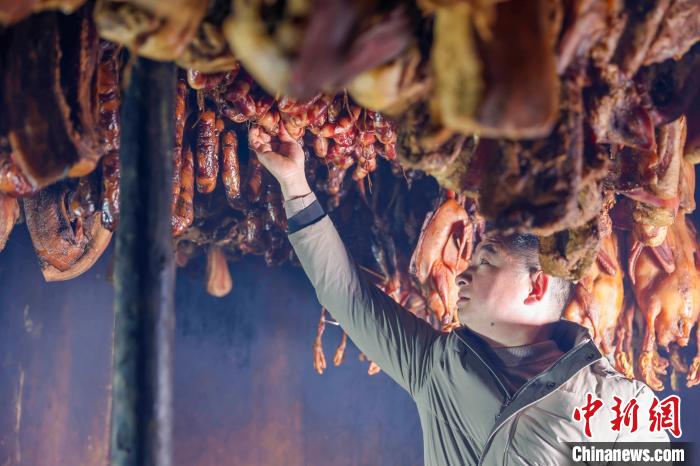圖為貴州施秉云臺(tái)村一農(nóng)家樂(lè)業(yè)主在查看熏制臘肉、香腸的情況。磨桂賓 攝
