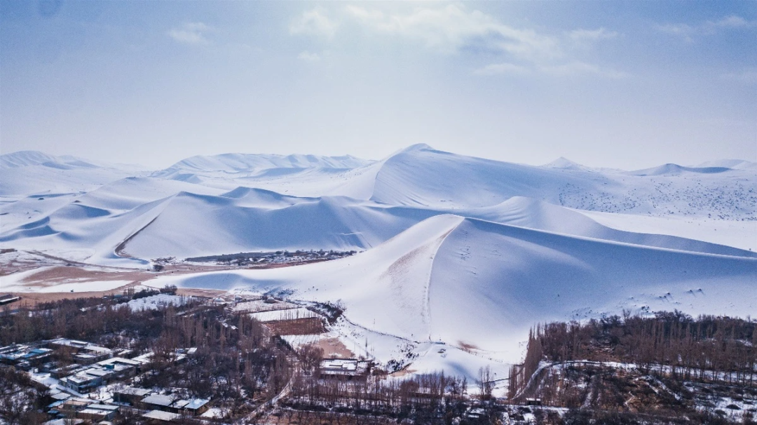 雪后鳴沙山銀裝素裹分外妖嬈。