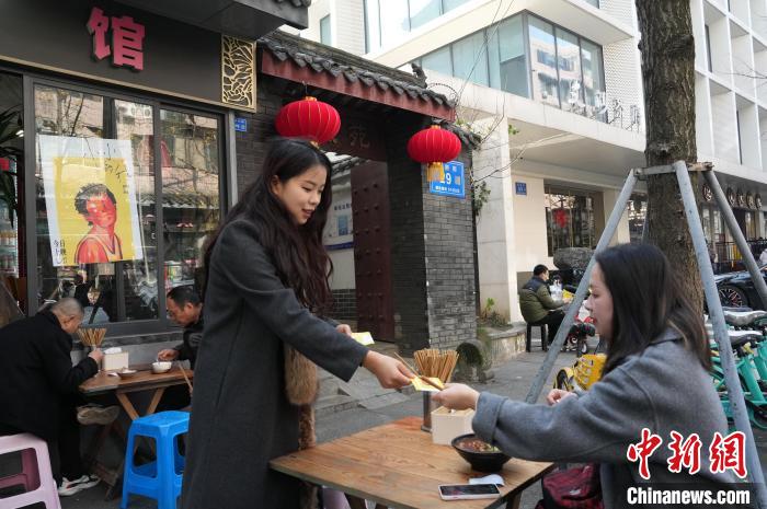 12月31日,四川成都,影迷在面館選購電影同款餐食。中新社記者 安源 攝