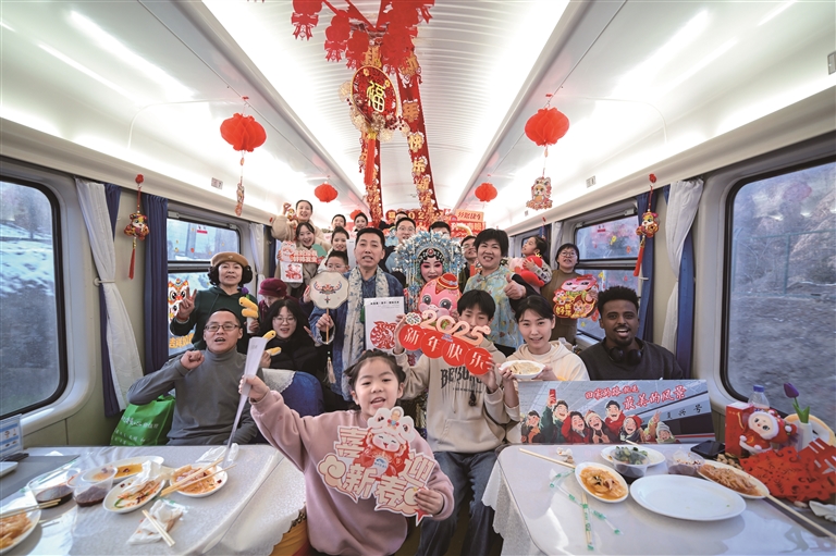 在歌聲、鼓聲、歡笑聲中,出鍋的餃子讓跨年列車的車廂年味更濃,把“春運(yùn)回家”這一樸素而又濃烈的幸福感,通過舌尖味蕾傳遞,把“團(tuán)圓便是年”“回家的路就是最美的風(fēng)景”,通過餃子這一代表著中國人情愫強(qiáng)烈的文化符號,將天南海北奔赴山海的人們團(tuán)聚在列車、歡度在旅途。