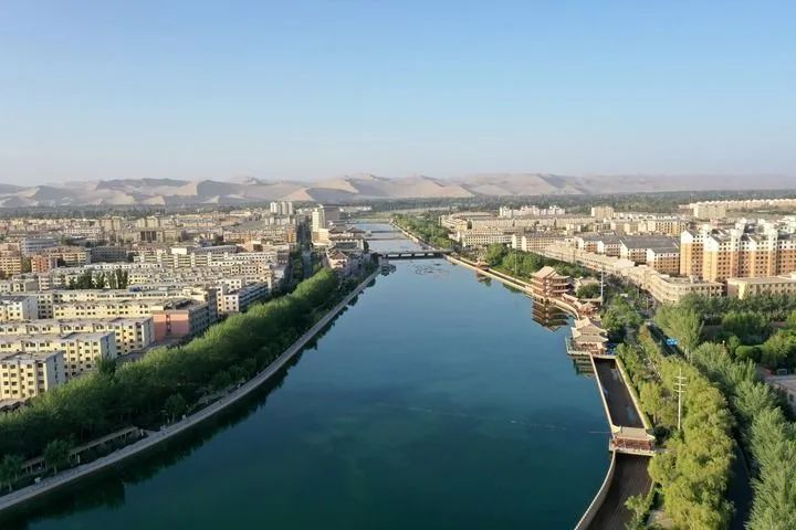 乘飛機(jī)從甘肅省會蘭州往西飛行約兩個小時后,茫茫戈壁上一個綠色小點(diǎn)出現(xiàn)在視線里。隨著飛機(jī)高度下降,俯瞰下去,一片多邊形的綠洲逐漸顯現(xiàn),如一塊美麗寶石。