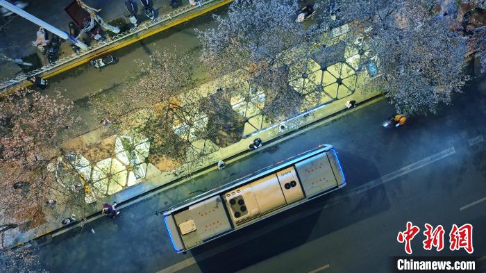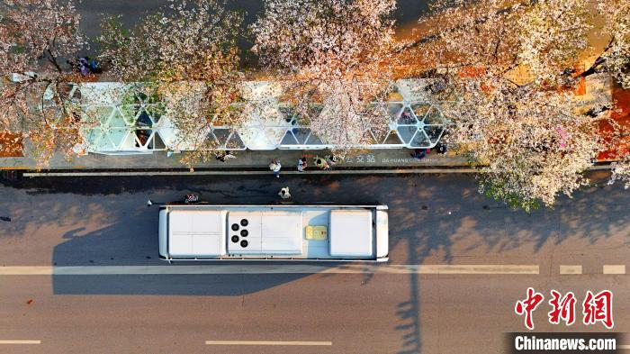 3月26日,被譽為武漢“最美櫻花車站”的珞喻東路大黃村公交站櫻花盛放。經(jīng)過改造的大黃村公交站,新增了自助售貨機、衛(wèi)生間、共享充電寶等便民設(shè)施,煥然一新的科技智慧站臺與粉白如霞的櫻花相映生輝。微風吹過,櫻花花瓣浪漫飄零,吸引不少市民游客觀賞“打卡”。圖為公交車在珞喻東路大黃村公交站停留。(無人機照片)劉康 攝