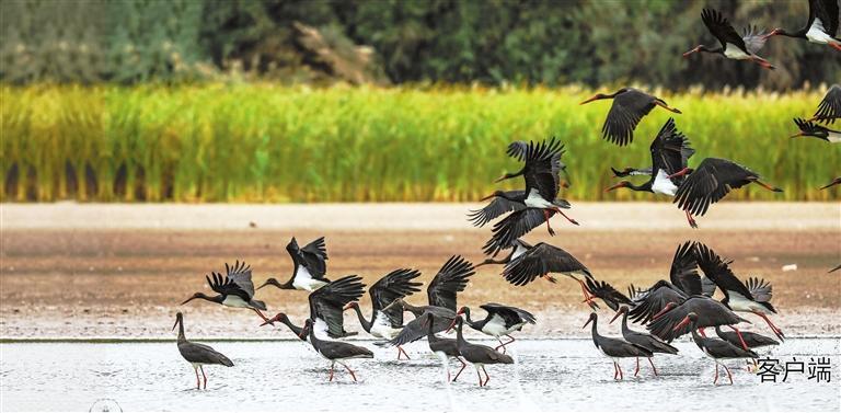 九月的黑河濕地,蘆葦蕩在秋陽(yáng)下鍍成金箔,黑鸛群如流動(dòng)的墨玉鑲嵌其中。這種因其配色和珍稀程度被稱(chēng)為“鳥(niǎo)中熊貓”的珍禽,是出色的捕魚(yú)能手。隨著它精準(zhǔn)鎖定水下獵物,赤紅色長(zhǎng)喙掠過(guò)水面,黑、白、紅的絕色搭配如同流動(dòng)的墨畫(huà)。中國(guó)最大的黑鸛種群——600余只在此集結(jié),夜棲時(shí)其倒影連成一線,讓觀鳥(niǎo)者想起傳世的水墨長(zhǎng)卷。