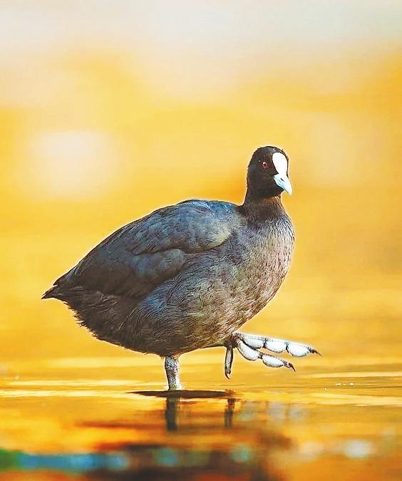 白骨頂又被喚作骨頂雞,卻是鶴類(lèi)的遠(yuǎn)親。它靜浮水面時(shí),額前一抹象牙白,宛若遺落人間的墨玉鎮(zhèn)紙。這枚額甲實(shí)為特化的角質(zhì)層,是為了保護(hù)頭部的盔胄?;野咨陌牾肴缪┑匮グ惆洪g,劃開(kāi)水藻時(shí)泛起粼粼波光——這身黑羽配雪蹼的穿搭,竟比時(shí)裝周的極簡(jiǎn)主義更先鋒。當(dāng)它們列隊(duì)掠過(guò)蘆葦蕩,水淼勾勒的剪影里,仿佛在繪制著秋天的信箋。