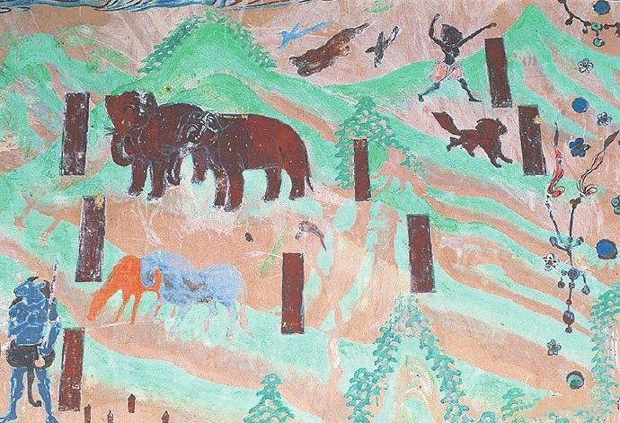 東漢應(yīng)劭在《風(fēng)俗通義·祀典》中寫道:“臘者,獵也,言田獵取獸以祭祀先祖也?;蛟唬?lsquo;臘者’接也,新故交接,故大祭以報(bào)功也。”意思是說一年中最后一個(gè)月是古人用來(lái)狩獵的月份,而狩獵所獲的獵物會(huì)被風(fēng)干做成臘肉來(lái)祭祀祖先。這個(gè)月也被叫作“獵月”或是“臘月”。據(jù)《禮記·月令》記載,在秋季的最后一個(gè)月舉行田獵,借此機(jī)會(huì)教民戰(zhàn)陣,練習(xí)五種兵器的使用,并頒布乘馬的政令。獵畢,命令主管祭祀的官員,用獵獲的鳥獸祭祀四方之神。在莫高窟第249窟壁畫中有一幅“行獵圖”:畫面上都是些體形巨大的動(dòng)物,有體態(tài)矯健的猛虎、疾馳駿逸的鹿群等。還有在奔馳的駿馬上拈弓搭箭窮追不舍的獵人、在飛奔的駿馬上淡定轉(zhuǎn)身從容射虎的獵人。整個(gè)畫面既緊張又靜謐美好,使人不由得對(duì)畫師精湛的技藝心悅誠(chéng)服。