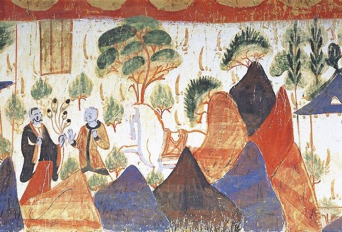 在敦煌壁畫中有關(guān)對(duì)弈的內(nèi)容較多。在莫高窟第454窟、第7窟壁畫中都有“弈棋圖”。兩幅圖的畫面有不少類似的地方:一是畫師較為突出棋盤的位置,兩幅壁畫中的棋盤都居中且形制相對(duì)巨大;二是畫面上的人物均為三人,兩人對(duì)弈,一人觀戰(zhàn),“觀棋不語(yǔ)真君子”;三是對(duì)弈者身后的景色都是天朗氣清、遠(yuǎn)山含黛。據(jù)說,一天,北宋大文豪蘇東坡與摯友黃庭堅(jiān)正在松樹底下弈棋。一陣風(fēng)吹來(lái),松果掉進(jìn)棋盤。蘇東坡隨即吟道:“松下圍棋,松子每隨棋子落。”黃庭堅(jiān)馬上回答道:“柳邊垂釣,柳絲常伴釣絲懸。”雅趣十足。其實(shí),棋局里的一動(dòng)一靜、一招一式無(wú)不需要謹(jǐn)小慎微、穩(wěn)扎穩(wěn)打。而對(duì)弈時(shí)的當(dāng)斷則斷、示假隱真、有效合作等戰(zhàn)術(shù)不僅是對(duì)弈的智慧,也是人生的哲理吧。