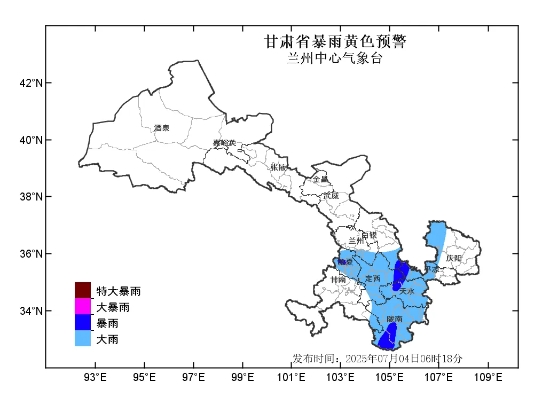 蘭州中心氣象臺(tái)2025年07月04日06時(shí)18分繼續(xù)發(fā)布暴雨黃色預(yù)警:過(guò)去24小時(shí)我省隴南市東部已出現(xiàn)大暴雨,最大降水量出現(xiàn)在武都裕河129.4毫米,預(yù)計(jì)未來(lái)12小時(shí)我省臨夏、定西、天水、隴南、平?jīng)龅戎菔胁糠值胤郊鞍足y市中南部、蘭州市南部、慶陽(yáng)市北部、甘南州東南部有大雨,其中隴南市南部、天水市西部,定西市東部、平?jīng)鍪形鞑?、白銀市南部、臨夏州西部有暴雨,最大累計(jì)雨量60-90毫米,強(qiáng)降水將持續(xù)至4日17時(shí),最大小時(shí)雨強(qiáng)可達(dá)20-50毫米。請(qǐng)注意防范強(qiáng)降水可能引發(fā)的中小河流洪水、城鄉(xiāng)積澇、山洪、滑坡和泥石流等次生災(zāi)害。