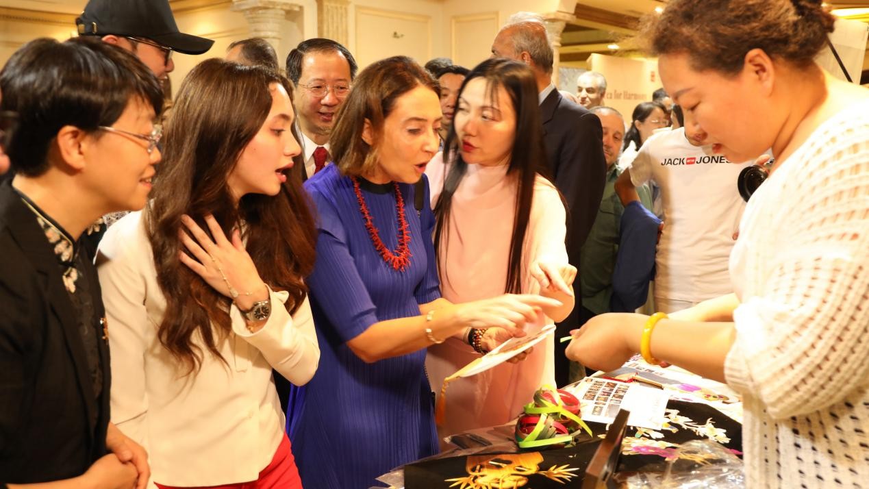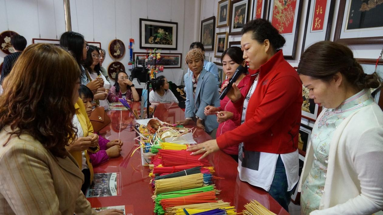 (唐彩萍在安曼為約旦王妃和公主及嘉賓現(xiàn)場制作麥稈畫)
