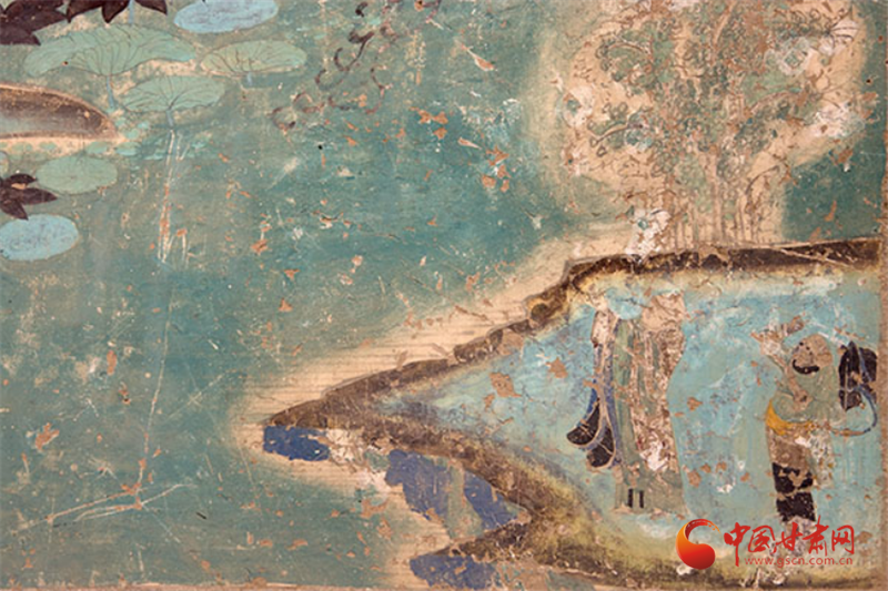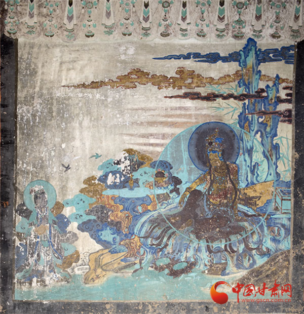兩幅作品均以青綠色調(diào)為主,觀音面部貼金雖已氧化,卻仍顯清新淡雅,更以“馬一角、夏半邊”的構(gòu)圖巧思,用對(duì)角線(xiàn)分割畫(huà)面、大量留白,讓有限的壁面生出無(wú)窮空間感,堪稱(chēng)中國(guó)傳統(tǒng)美學(xué)與佛教哲理的完美融合——正如唐代白居易贊水月觀音“凈淥水上,虛白光中”,這般意境在榆林窟的壁畫(huà)里被演繹得淋漓盡致。