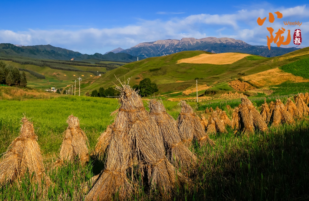 目之所及,金黃的麥捆與綠色相互映襯,用最燦爛最飽滿的顏色詮釋這片土地的豐收與希望。而遠(yuǎn)處連綿起伏的山巒,更是為這幅畫(huà)卷增添了幾分雄渾而壯闊。