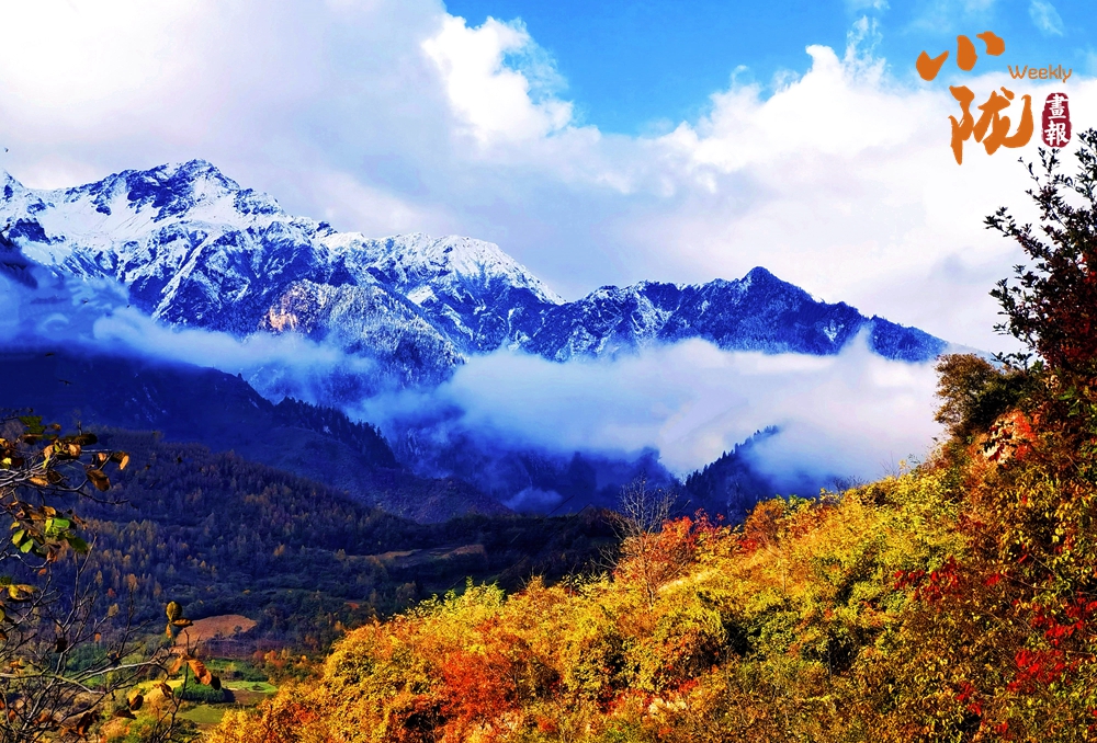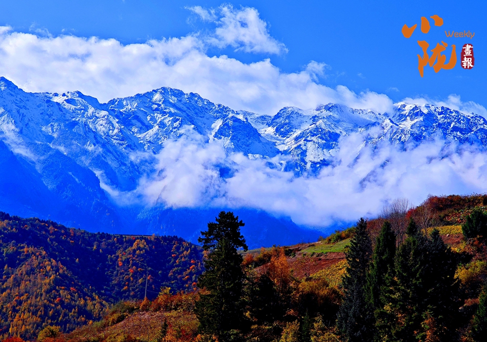 山巔的白雪與彩林形成鮮明對比,紅與黃,白與藍(lán),在陽光的映照下,共同編織出一幅溫柔而夢幻的畫卷。