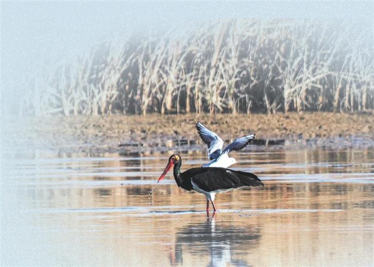 除了灰鶴,黑河濕地還吸引了許多珍稀候鳥。白琵鷺就是其中之一,它們的喙扁平而修長,像一把小小的琵琶,因此得名。它們的羽毛潔白如雪,在陽光下幾乎透明,飛行時翅膀展開,像一片白色的云,緩緩掠過濕地的上空。