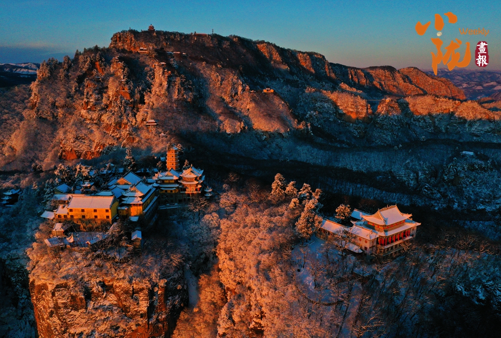 群山裹素,起伏的線條在極致湛藍(lán)的天穹下舒展,積雪壓彎枝頭,形成道道玉弧。而點(diǎn)綴其間的廟宇樓閣,默然佇立,飛檐上的殘雪泛著微光,與這片寧靜的藍(lán)白色調(diào)共同構(gòu)成一幅和諧、安詳?shù)男麓貉┚啊?/p>